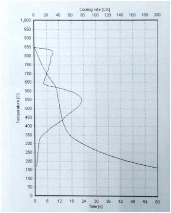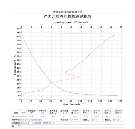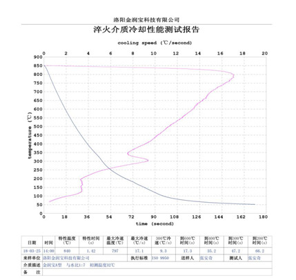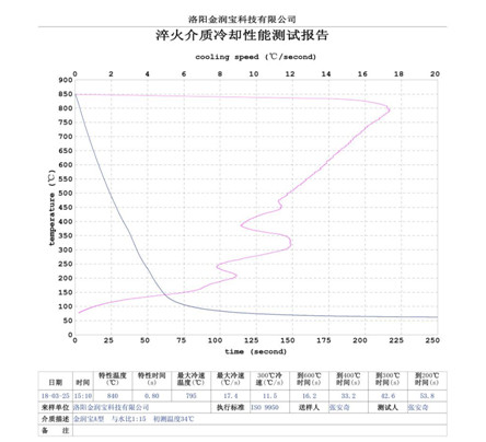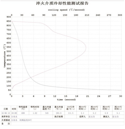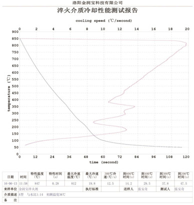 淬厚大件高鉻鑄鐵適宜的ZFQ-A型淬火劑的濃度:原液與水配比1:6,其 大冷卻速度150C/s——200C/s之間, 大冷卻速度所在的溫度在7800C——8300C之間,在3000C的冷卻速度小于6.50C/s,在3000C到2000C馬氏體轉(zhuǎn)變溫度區(qū)域內(nèi)所用時(shí)間大于20秒(S),(采用冷卻介質(zhì)測定儀測定,測定溶液溫度300C,)。