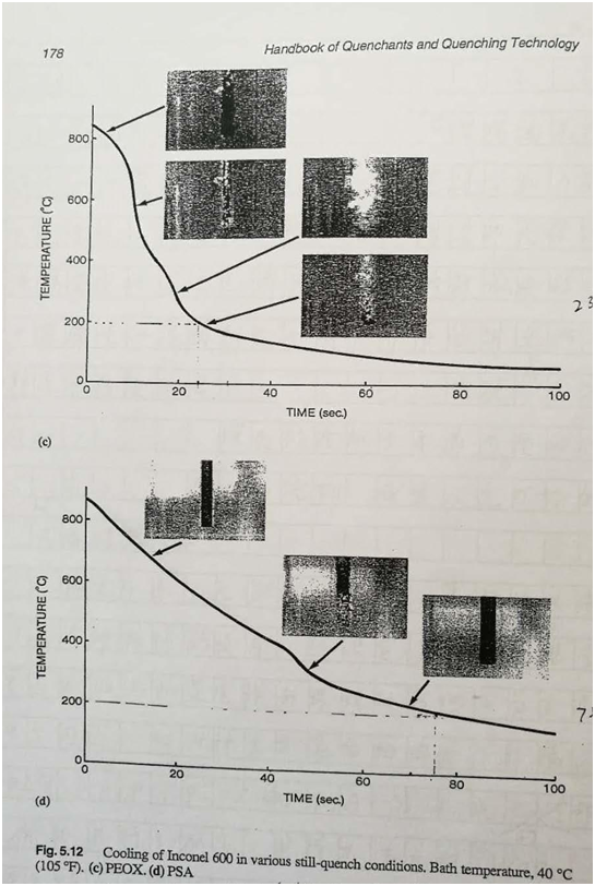 淬火介質(zhì),無論是油、水、聚合物水溶液,其冷卻機(jī)理的改變,起決定作用的是熱金屬表面上液體和蒸汽膜性的影響。為了證明這個(gè)這個(gè)問題,對(duì) 4 種主要聚合物淬火介質(zhì):PAG、PVP、PEOX 和 PSA 的 A、B、C三個(gè)冷卻階段進(jìn)行了研究,具體辦法是對(duì) lnconel 600 探頭淬入介質(zhì)后,在它的金屬和溶液界面上發(fā)生的現(xiàn)象進(jìn)行照相。圖 2(a)、(b)、(c)、(d)分別表示了這些照片被疊加到真實(shí)的冷卻曲線上。圖 2 中部曲線是在靜止的濃度為 20%的聚合物水溶液中測(cè)定的。這研究結(jié)果不能被過度解釋。因?yàn)槊糠N淬火介質(zhì)在介質(zhì)溫度、濃度和攪拌條件變化的條件下,淬火行為會(huì)在很大的范圍內(nèi)變化。這些圖簡(jiǎn)單地說明,在熱金屬界面上,聚合物膜形成的性能是不同的。